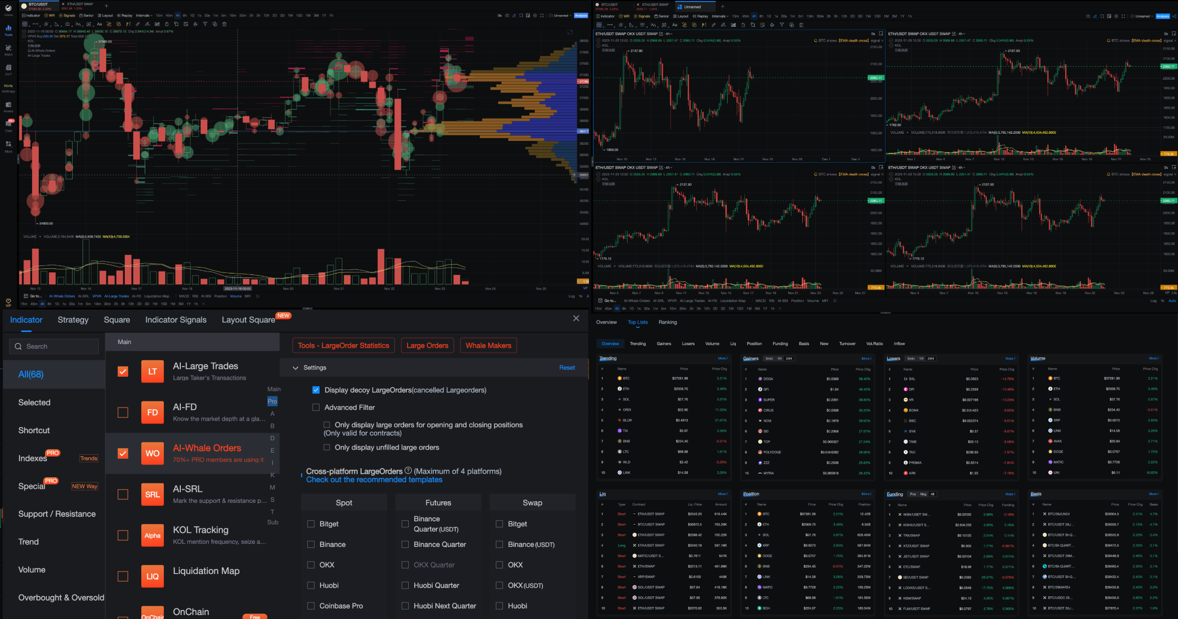 强大的K线图表功能,可编程的自定义指标工具,35+交易所行情数据,多种预警,社媒消息,巨鲸以及大单跟踪